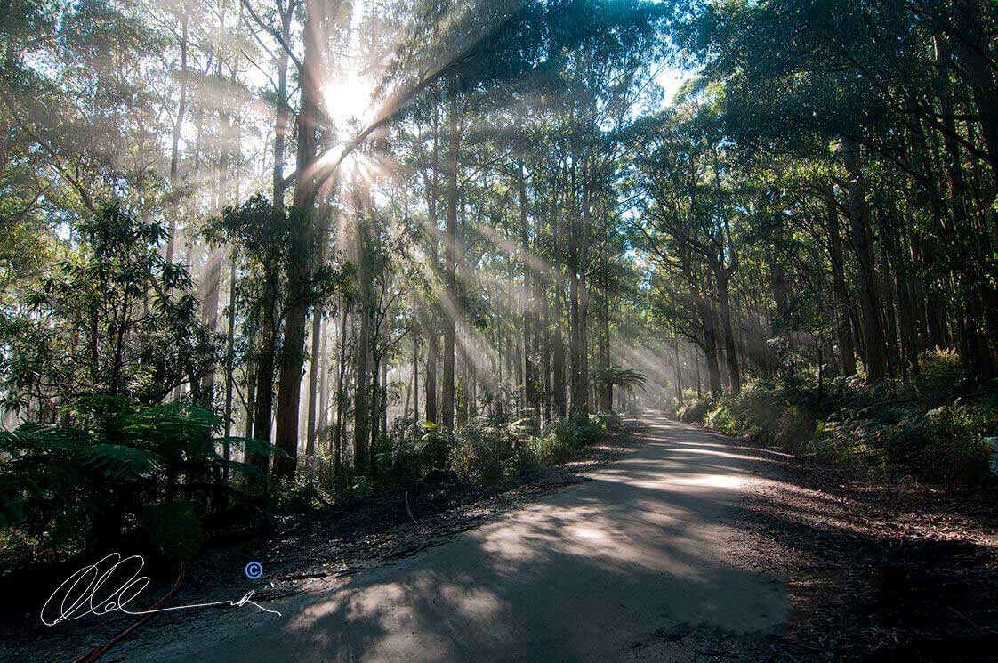 Heavy burst of morning sunrays through forest trees on Beenak Road at Gembrook, VIC.