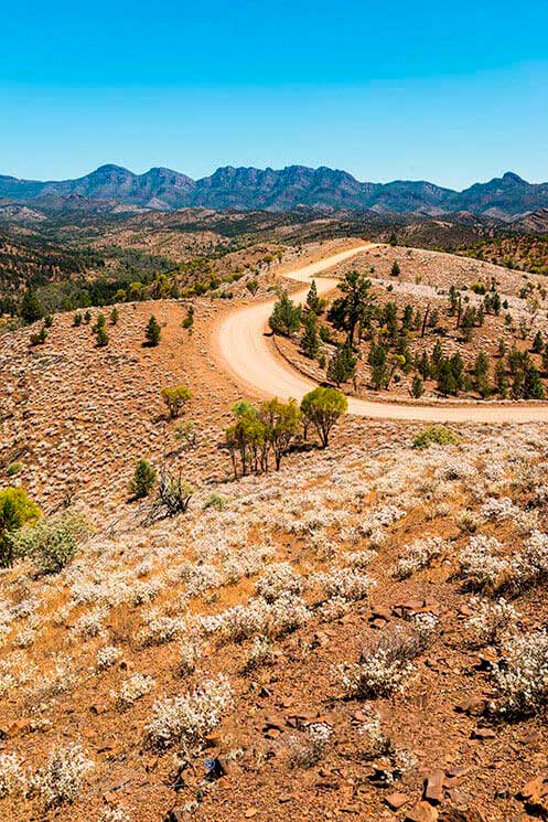 Yellow dirt tourist road winds towards distant hills and through flowering outback terrain. Flinders Ranges, S.A.Flinders Ranges, S.A.